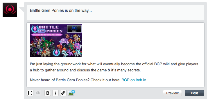 | I'd have a post or two up and some templates underway, but the website was being glitchy and wouldn't save any of my posts, so I dropped it for now. I'll come back when the game's in beta. |